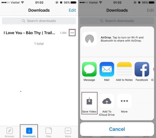 Nhấn nút … phía bên phải video. Nếu bạn muốn lưu vào iPhone/iPad hãy chọn Open In.