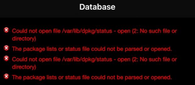 Lưu ý: Để thực hiện được việc fix lỗi cydia dưới đây thì thiết bị của bạn phải được cài đặt sẵn 1 trong 2 tweak là iFile hoặc Filza Manager và bạn phải chắc chắn rằng thiết bị của mình gặp lỗi như hình dưới.