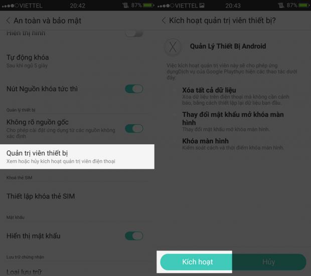 Người dùng có thể khoá, định vị và xoá dữ liệu từ xa bằng Trình quản trị của máy. Để thực hiệc việc này, các bạn vào Cài đặt > Bảo mật > Quản trị viên thiết bị > Kích hoạt