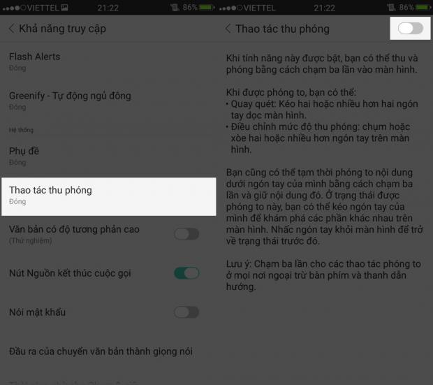Tính năng này giúp mọi người có thể phóng to mọi thứ trên màn hình. Điều này rất hữu ích cho những bạn có thị lực kém. Chỉ cần vào Cài đặt > Khả năng truy cập > Thao tác thu phóng, sau đó nhấn 3 lần vào màn hình để phóng to bất kì vị trí nào trên màn hình.