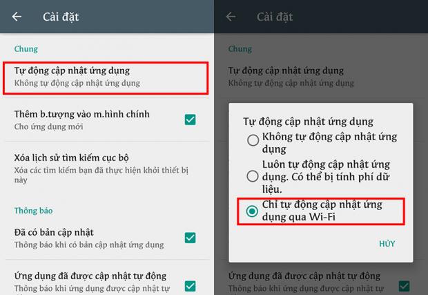 Vì vậy, bạn hãy tắt chức năng tự cập nhật ứng dụng bằng cách vào Google Play Store -> chọn vào 3 dấu gạch ngang -> Cài đặt -> Tự động cập nhật ứng dụng -> Chỉ tự động cập nhật ứng dụng qua Wi-Fi.