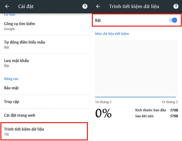 Để bật tính năng, các bạn vào trình duyệt Chrome -> chọn Cài đặt -> Trình tiết kiệm dữ liệu -> Bật tính năng này lên.