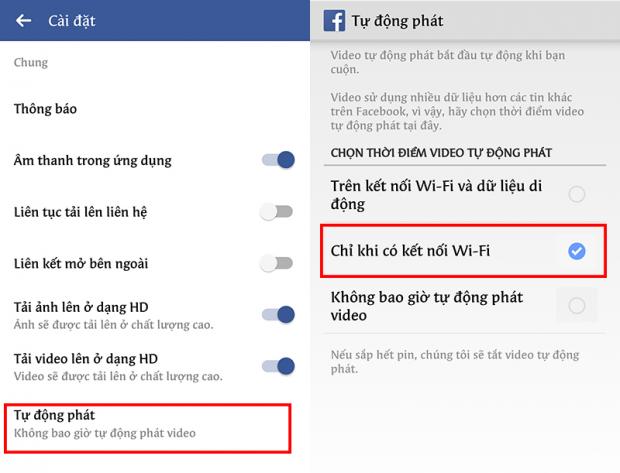 Để tắt tính năng tự phát video trên Facebook, cách bạn vào Facebook -> chọn Cài đặt ứng dụng -> Tự động phát -> Chỉ khi có kết nối Wi-Fi.