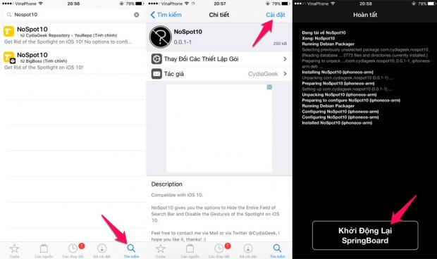Tiếp theo, chuyển qua tab tìm kiếm và nhập tên tweak NoSpot10 (hoặc thấp hơn tùy vào phiên bản iOS) để cài đặt lên thiết bị. Sau khi cài đặt xong nhấn nút 'Khởi động lại SpringBoard' để hoàn tất.