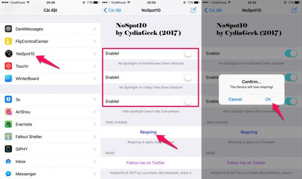 Quay ra màn hình chính > truy cập Cài đặt > cuộn xuống phía dưới chọn NoSpot10 và kích hoạt khóa thanh tìm kiếm Spotlight tùy theo vị trí mong muốn > nhấn Respring để áp dụng các thiết lập là xong.
