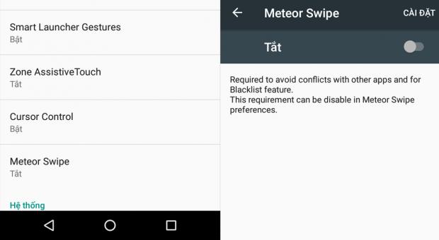 Trong mục Trợ năng, bạn tìm ứng dụng Meteor Swipe và kích hoạt quyền truy cập là xong.