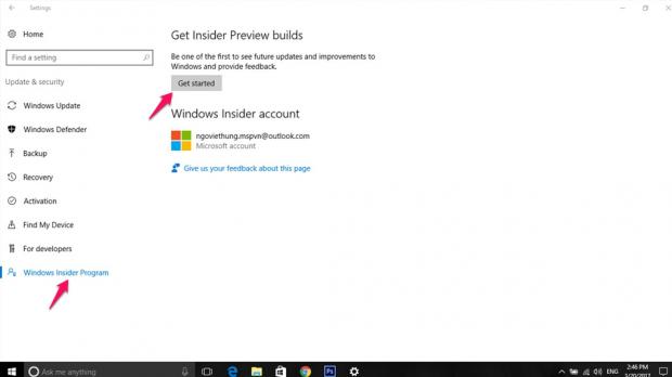 Bước 2: Tìm đến Windows Insider Program, click Get Started