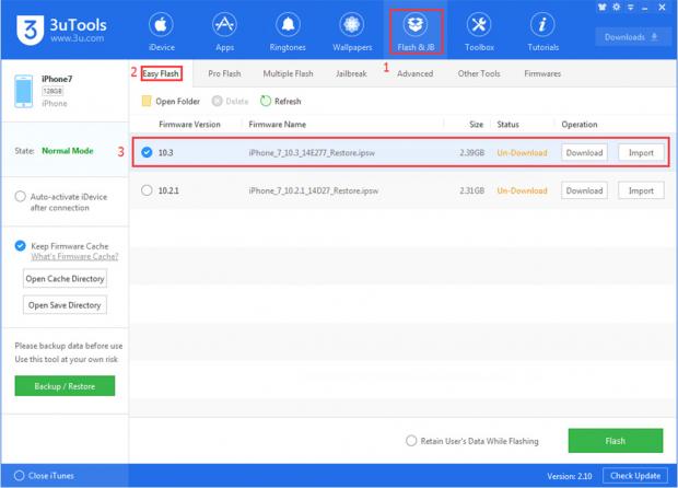 Bước 4: Vào Flash & JB → Easy Flash. Tại đây hãy chọn Firmware Version là 10.3. Nhấn chọn Download, đợi để 3uTools tải về (phụ thuộc khá nhiều vào tốc độ mạng của bạn nhé).