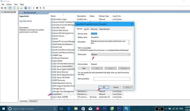 Bước 2: Tìm và disable service Connected User Experiences and Telemetry và bật chế độ manual cho service Superfetch. Còn một số service để tắt nữa, link nằm ở gần cuối bài nhé.