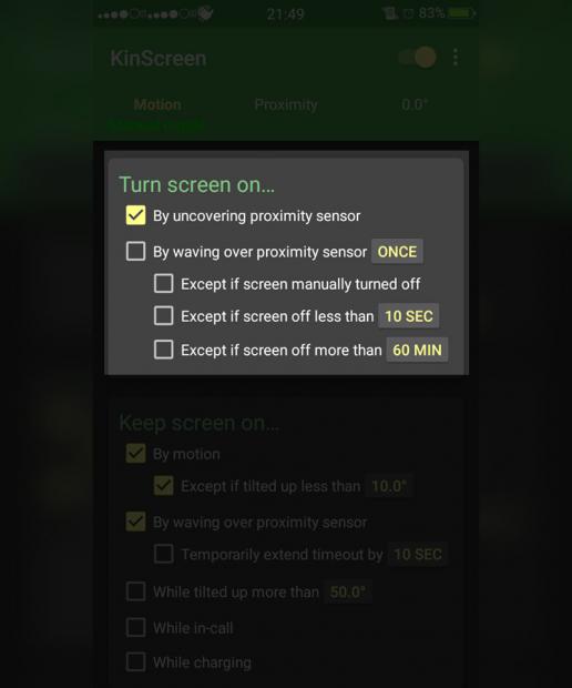 Kinscreen là một ứng dụng giúp bạn bật/tắt màn hình điện thoại bằng cách sử dụng cảm biến tiệm cận và phân tích chuyển động của smartphone, mà người dùng không cần phải động tay vào. Các bạn có thể tải về tại link bên dưới.