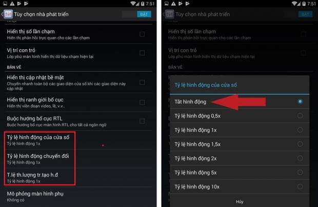- Truy cập vào Cài đặt > Tùy chọn nhà phát triển > Sau đó tắt hình động ở các mục lựa chọn.