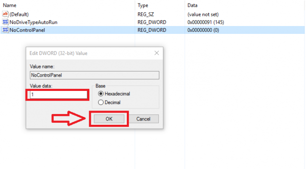 Tiếp theo, bạn nhấp đúp chuột vào NoControlPanel và tiến hành chuyển giá trị biến mới từ 0 sang 1.