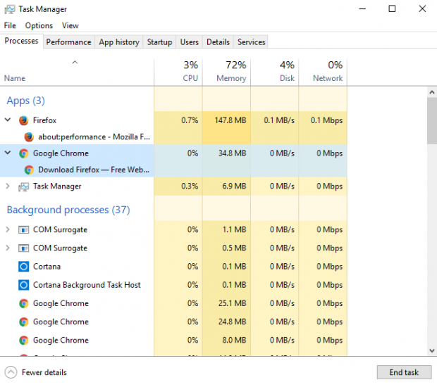Đối với Firefox, Task Manager sẽ chỉ ra mức sử dụng CPU của thẻ hiện hoạt, người dùng phải thao tác tách các thẻ ra thành các cửa sổ riêng biệt hoặc di chuyển qua lại giữa chúng trong khi theo dõi các chỉ số.