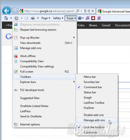 Kích nút Tools trên thanh Command và chọn Toolbars|Manage add-ons từ thực đơn hiện ra.