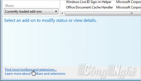 Trên hộp thoại Manage Add-ons, kích vào đường link Find more toolbars and extensions ở góc dưới bên trái hộp thoại.