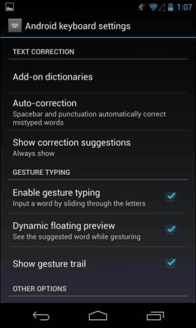 Màn hình Android keyboard settings chứa nhiều tùy chọn để vô hiệu hóa các tính năng như vuốt, tự động sửa lỗi, tự động viết hoa, các gợi ý từ tiếp theo. Bạn cũng có thể làm cho việc tự động sửa lỗi thông minh hơn hoặc chuyển sang những cách bố trí bàn phím khác, như cách bố trí bàn phím tiếng Pháp chẳng hạn.