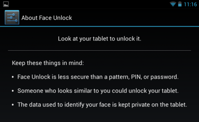 lưu ý rằng, Face Unlock kém an toàn hơn so với Pattern, PIN và Password vì theo lý thuyết, một người nào đó có thể đăng