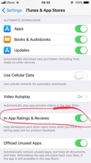 Bước 3: Cuộn xuống đến khi thấy tùy chọn In-App Ratings & Reviews thì nhấp chọn thanh trượt bên cạnh để tắt tính năng này.