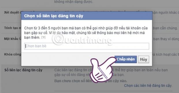 Facebook có tính năng Trusted Contacts (Số liên lạc đáng tin cậy) sẽ giúp chúng ta tìm lại được mật khẩu khi lựa chọn 3 đến 5 người để thêm vào mục tin cậy. Nếu chưa biết cách thực hiện, hãy tham khảo bài Cách lấy lại mật khẩu Facebook nhờ bạn bè nhé.