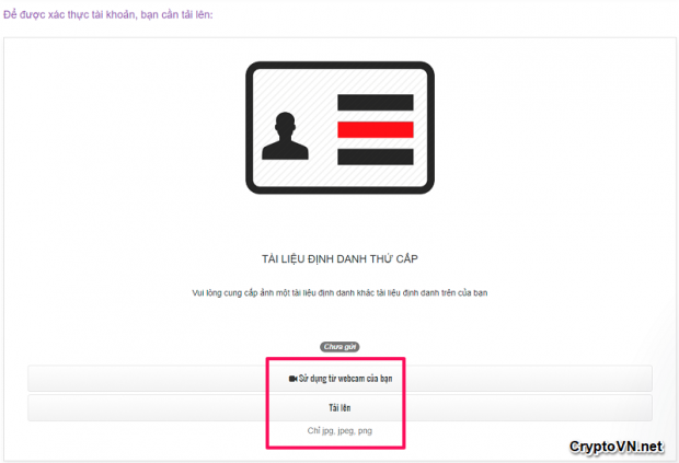 Bước 6: Đây là bước cuối cùng, bạn cần tải lên tài liệu định danh thứ cấp, ngoài tài liệu định danh được tải lên ở bước 2. Tài liệu định danh thứ cấp cũng dễ hơn, bạn có thể sử dụng CMT, hộ chiếu, giấy phép lái xe, hóa đơn, bảo hiểm, hộ khẩu. Nhấn nút tải lên để tải ảnh chụp đã có hoặc nhấn nút Sử dụng webcam để chụp ảnh trực tiếp.
