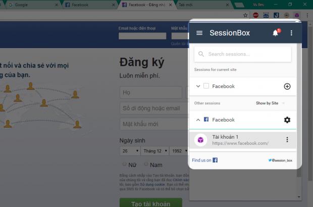 Bước 4: Lặp lại các bước trên với các tài khoản Facebook khác nhau. Giờ đây để sử dụng nhiều tài khoản, bạn chỉ cần chọn vào biểu tượng SessionBox và chọn tài khoản mà chúng ta đã thêm là được.