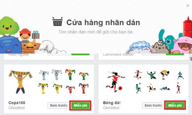Tìm các bộ sticker liên quan đến bóng đá và bấm nút Miễn phí để cài đặt là xong.