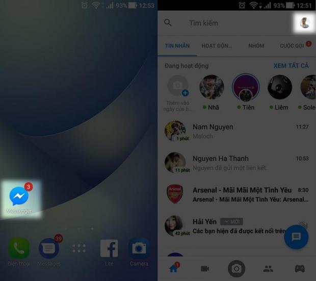 Để tắt nó đi thì các bạn vào Messenger, nhìn phía trên của ứng dụng sẽ thấy biểu tượng cá nhân có chứa avatar facebook của bạn thì bấm vào đó.