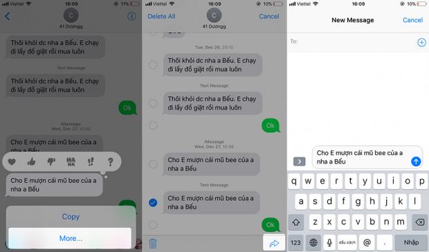 Để chuyển tiếp tin nhắn trên iPhone, bạn không cần phải sao chép tin nhắn rồi gửi cho bạn bè mà chỉ cần ấn giữ vào tin nhắn cần chuyển tiếp > Chọn More… > Chọn vào biểu tượng hình mũi tên góc dưới bên phải > Nhập tên người gửi và gửi đi.