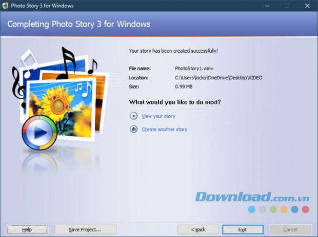 Sau đó thông tin video đã tạo của bạn sẽ được hiện lên, như tên, đường dẫn chứa file và dung lượng video, View your story là để bạn xem lại video vừa tạo, Create another story là tạo một video mới.