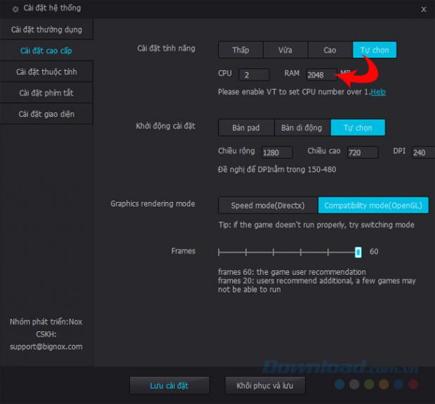 Tùy chọn cấu hình hoặc tự điều chỉnh lượng RAM muốn cấp cho giả lập Nox App Player