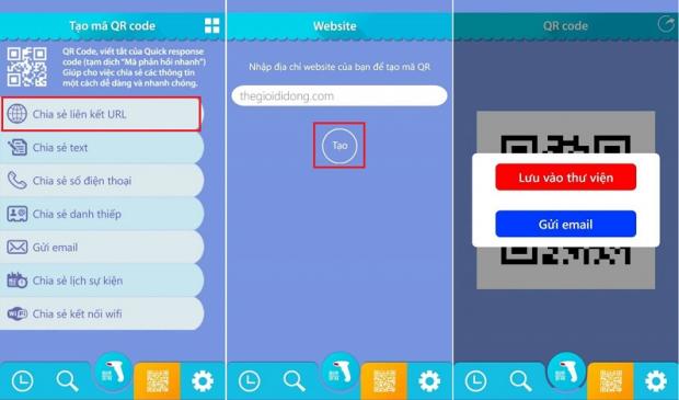 Ứng dụng còn hỗ trợ bạn tự tạo mã QR code để chia sẻ những: Link, danh bạ, email rất tiện lợi. Ví dụ như mình muốn tạo một mã QR Code cho danh thiếp, số điện thoại, email... để chia sẻ bất cứ khi nào cần.