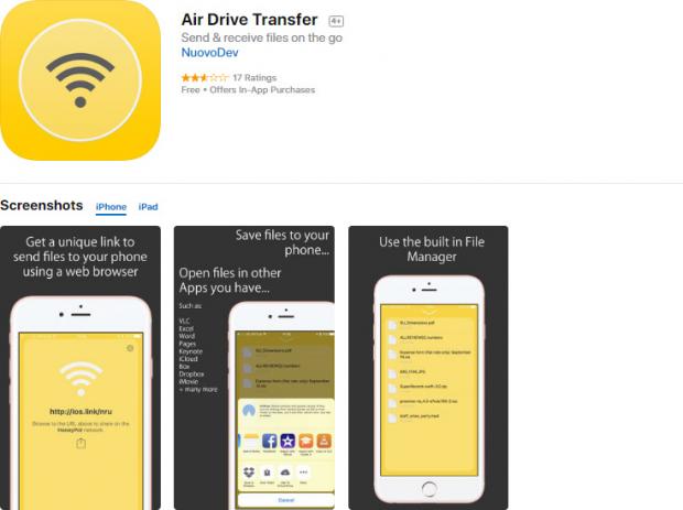 Ứng dụng cho phép người dùng chuyển tiếp hoặc gửi dữ liệu trực tuyến mà không cần kết nối qua cáp truyền thống. Cách sử dụng khá đơn giản, chỉ cần kết nối WiFi sau đó mở Air Drive và gửi liên kết gợi ý trong ứng dụng cho người được nhận dữ liệu để tiến hành gửi các tệp tin mong muốn.
