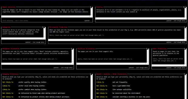 Về cơ bản, extension này sẽ theo dõi hoạt động của bạn bao gồm những gì bạn đang xem, bạn xem trong vòng bao lâu, bạn thích những gì, bạn click vào những nội dung gì và bạn ghi những gì trên đó. Sau đó, tiện ích sẽ áp dụng thuật toán máy học và xử lý ngôn ngữ tự nhiên từ IBM Watson và Đại học Cambridge, để chuyển dữ liệu này thành những thống kê rồi báo cáo chi tiết cho người dùng.