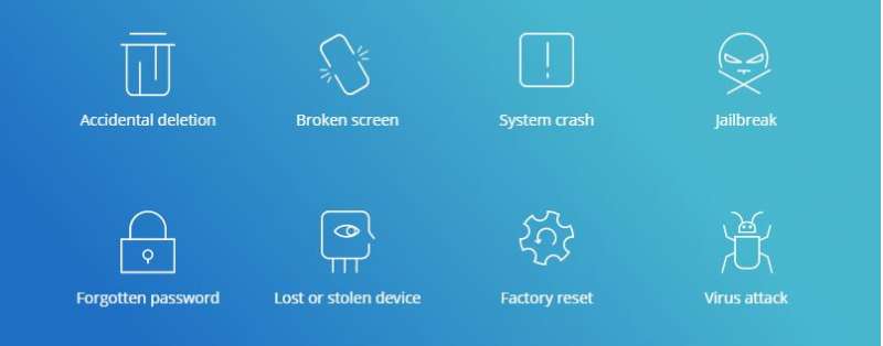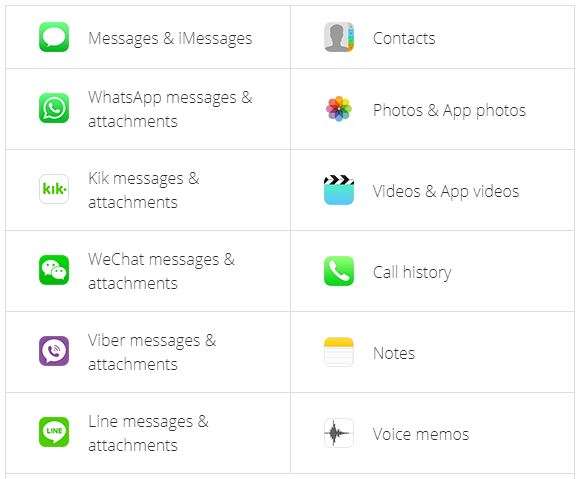 - Hỗ trợ hơn 20 loại dữ liệu khác nhau, bao gồm các nền tảng ứng dụng WhatsApp, WeChat, Kik, ảnh, tin nhắn, danh bạ, ghi chú, …