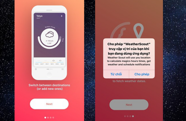 - Ở lần đầu tiên sử dụng, WeatherScout sẽ gợi ý sơ lược cho bạn về các tính năng mà ứng dụng mang lại. Và giống như các ứng dụng về thời tiết khác, WeatherScout cũng cần bạn cho phép được quyền truy cập vào chức năng định vị. Hãy nhấn “Cho phép” để xác nhận điều này.