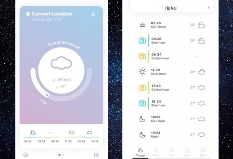 - Khi hoàn tất, giao diện chính của WeatherScout sẽ hiện ra với những thông tin về thời gian, tình trạng thời tiết hiện tại, mức gió và nhiệt độ tại nơi bạn đang sống. Bên dưới sẽ là mục dự báo thời tiết các khoảng thời gian sắp tới. Chỉ cần vào phần dự báo thời gian, bạn sẽ được cung cấp một danh sách các thời điểm phù hợp cho việc chụp ảnh, cũng như thông tin thời tiết các ngày trong tuần.