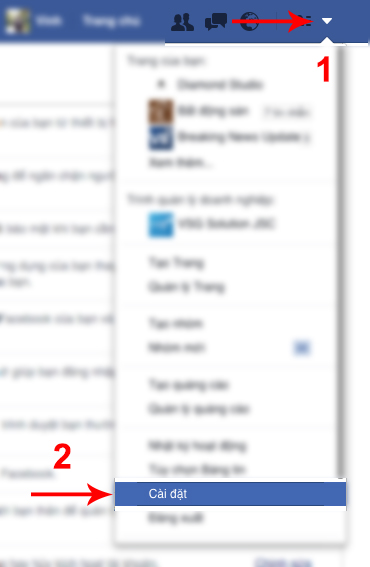 Trước tiên bạn hãy đăng nhập vào tài khoản Facebook của bạn sau đó chọn hình tam giác bên phải trên cùng (Theo ảnh) -> Cài đặt: