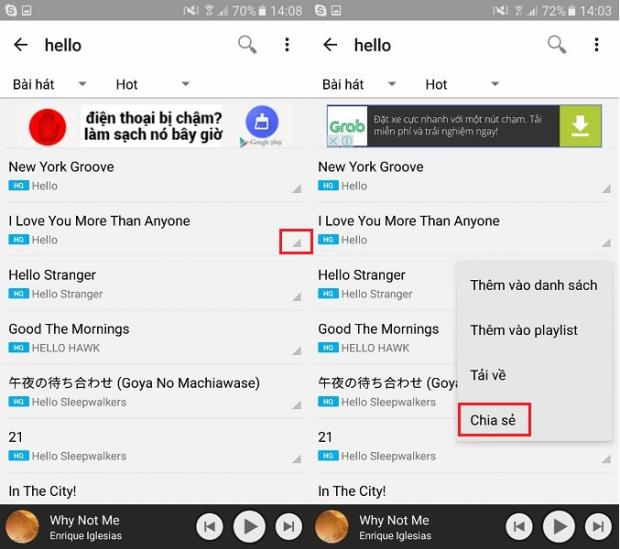 Bước 3: Một danh sách liên quan đến từ khóa bạn tìm kiếm sẽ hiện ra. Bạn nhấn vào biểu tượng hình tam giác ở cuối bài hát muốn tải về. Chọn chia sẻ.