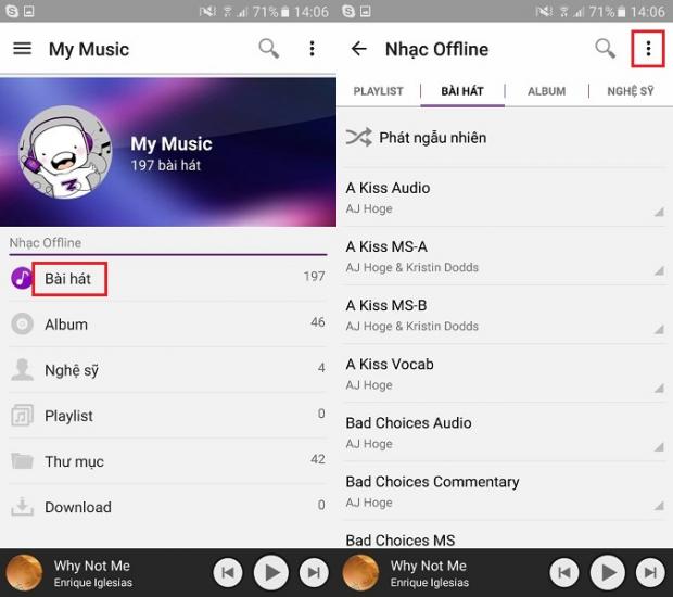 Bước 5: Nhạc download về cũng sẽ được lưu trong thư mục bài hát của ứng dụng Zing MP3 và mặc định app Zing MP3 cũng không biết được sự tồn tại của những file được down về bằng Ziba Downloader. Để hiển thị bài hát bạn vừa tải về. Bạn vào thư mục Bài hát và nhấn vào biểu tượng 3 chấm ở góc trên bên phải màn hình.