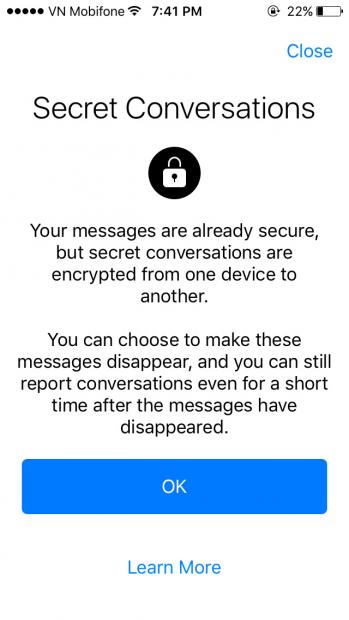 Với Secret Conversations, cuộc chat giữa 2 người sẽ mã hoá giữa 2 đầu thiết bị, không thể lọt ra bên ngoài, nhà cung cấp ứng dụng cũng không đọc được. Đặt biệt, chế độ này có thêm tính năng cài đặt thời gian tự hủy, tin nhắn sẽ biến mất sau khi người nhận đọc tin nhắn, với khoảng thời gian do người gửi ấn định.