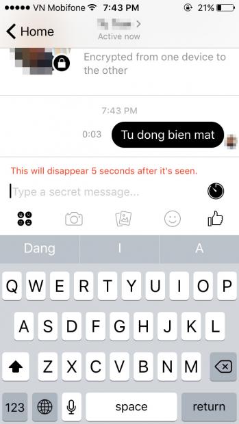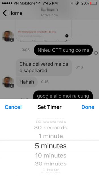 6. Sau khi đã chọn khoảng thời gian 'tự hủy' mong muốn. Mỗi tin nhắn bạn gửi đi sẽ đính kèm đồng hồ đếm ngược, và nó chỉ chạy sau khi người nhận đọc được nội dung.