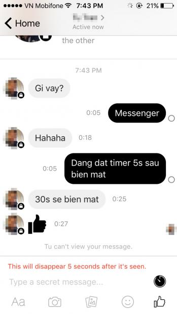 5. Bạn có thể chỉnh thời gian các tin nhắn của mình tồn tại sau khi người nhận đọc được, bằng cách bấm vào biểu tượng đồng hồ bên phải ô gõ chữ. Có nhiều thời gian để bạn chọn, từ 5 giây cho đến tối đa 1 ngày.