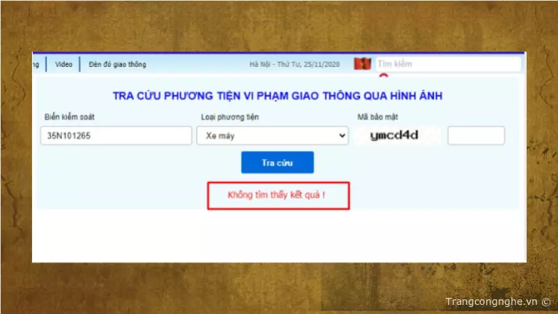 Bước 4: Nhấn vào 'Tra cứu' để xem kết quả. Hệ thống sẽ hiển thị thông tin vi phạm giao thông của phương tiện qua hình ảnh từ camera. Nếu không tìm thấy kết quả, có nghĩa là phương tiện không bị phạt nguội.