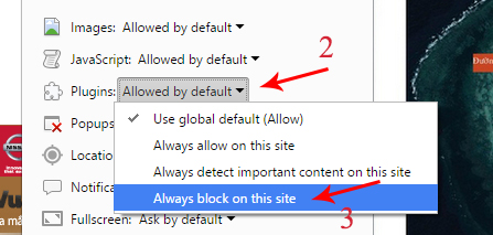 2. Tại danh sách 'Plugins' chọn 'Always block on this site'.