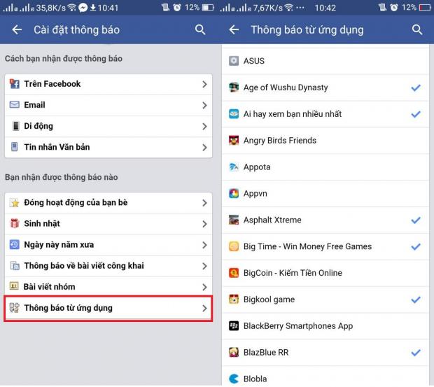 Đầu tiên, bạn Vào Cài đặt > Cài đặt tài khoản > Thông báo > Thông báo từ ứng dụng, sau đó bỏ dấu chọn ở những mục không cần thiết.