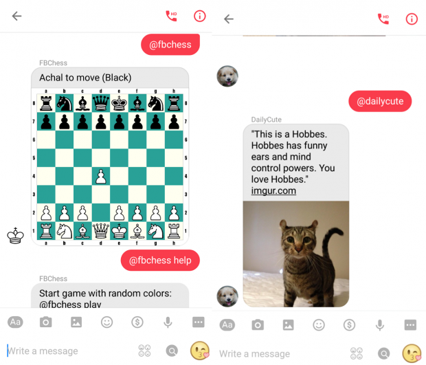 Khi bạn gõ @dailycute vào khung chat, một bức ảnh dễ thương ngẫu nhiên sẽ hiện ra như một chú cún hay một nàng mèo. Còn khi gõ @holidaychallenge có vẻ như bạn sẽ nhận được một thử thách cho những người đang chat với nhau.Còn với @fbchess, bạn sẽ nhận được một bàn vờ vua nhưng cách chơi khá phức tạp.