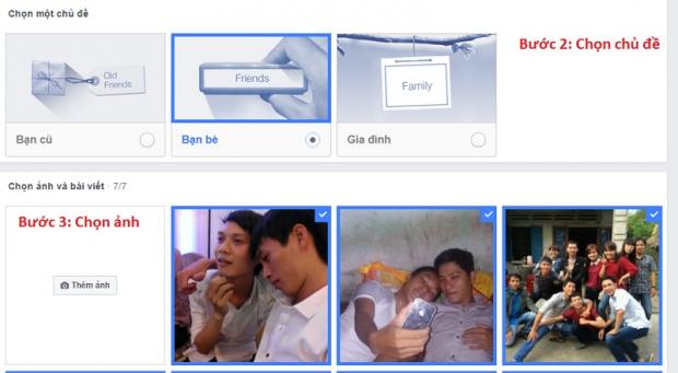 Bước 3: Kéo xuống phía dưới, tại đây bạn được cung cấp 3 chủ đề khác nhau gồm: Bạn cũ, bạn bè và gia đình. Sau khi lựa chọn xong chủ đề, bạn có thể tùy chọn những hình ảnh chung của 2 người được cung cấp ngay bên dưới. Hoặc có thể tải lên hình ảnh khác nếu bạn thích.