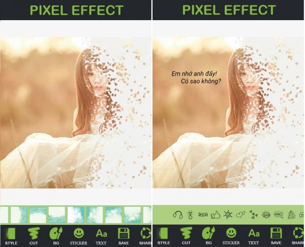 Với Pixel Effect bạn có nhiều tùy chọn chỉnh sửa sao cho phù hợp với bức ảnh như hiệu ứng tan biến, thêm vài sticker cho ảnh thêm hấp dẫn hay chèn vào văn bản chú thích một câu slogan nào chẳng hạn.
