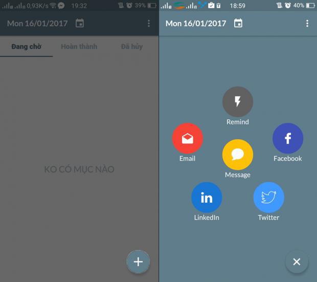 Khi mở lên, người dùng chỉ việc nhấn vào dấu + để tạo những lời nhắc. Bạn có thể chọn SMS, Facebook, email,... tuỳ theo ý muốn của mình.