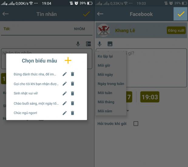 Người dùng cũng có thể chọn những biễu mẫu có sẵn để làm nội dung tin nhắn cho mình. Cuối cùng, bạn nhấn vào nút V để lưu lại, khi đến hẹn, ứng dụng sẽ tự động gửi theo lịch đã đặt trước.